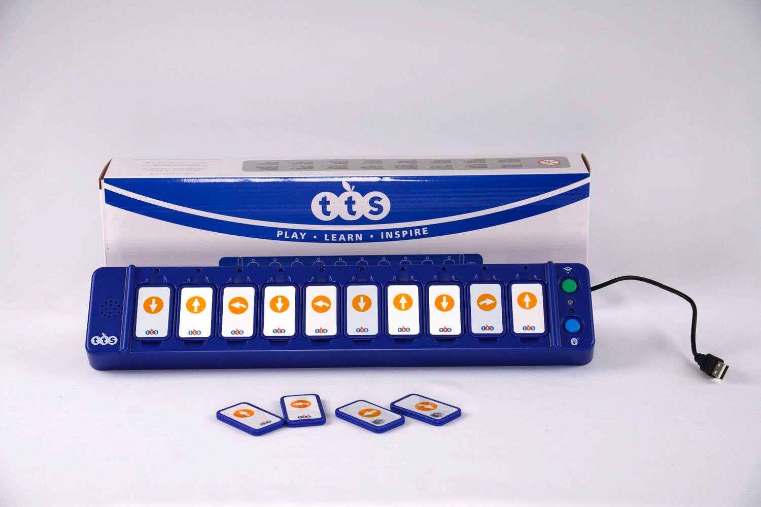 Mit dieser Programmierleiste wird der Blue-Bot via Bluetooth gesteuert. Die Plättchen mit den Befehlen vorwärts, rückwärts, rechts oder links werden auf der Leiste in der gewünschten Reihenfolge platziert. Mit dem Startknopf wird der Befehl für die Bewegungsabfolge an den Blue-Bot übermittelt.